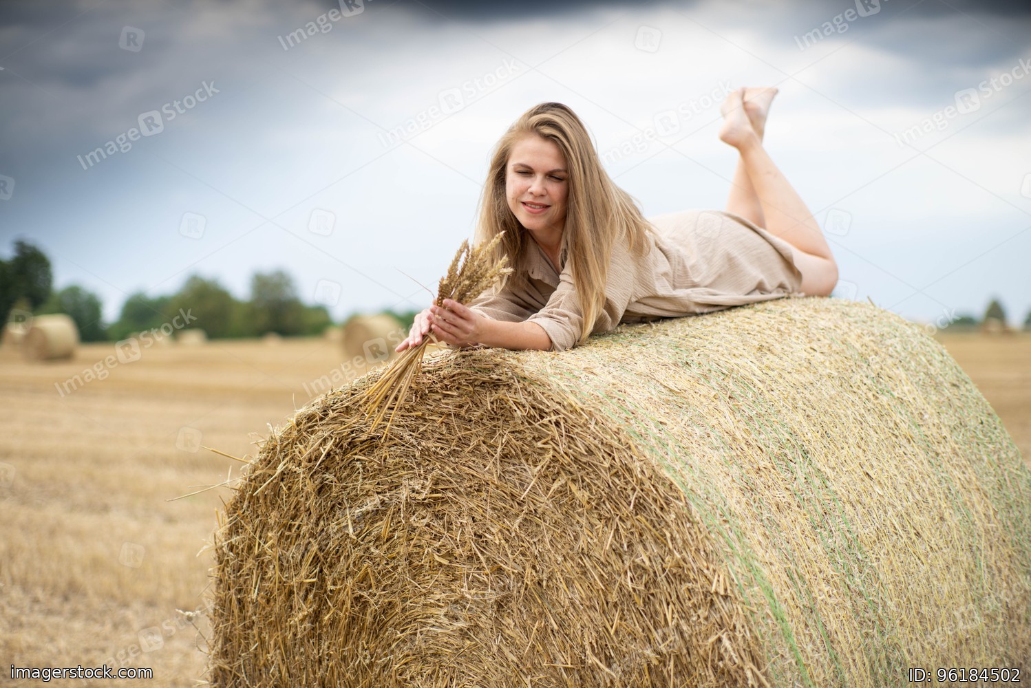 Beautiful happy woman lying on a haystack.