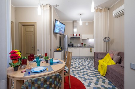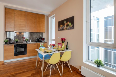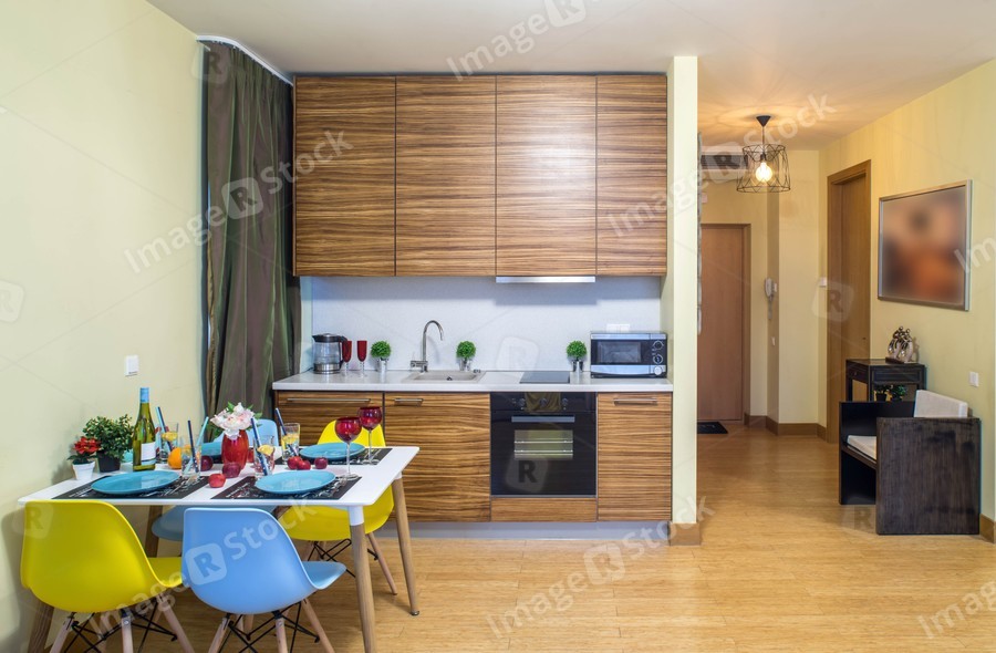 Modern interior of studio apartment. Ktchen set. Entrance hall.