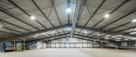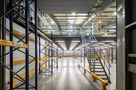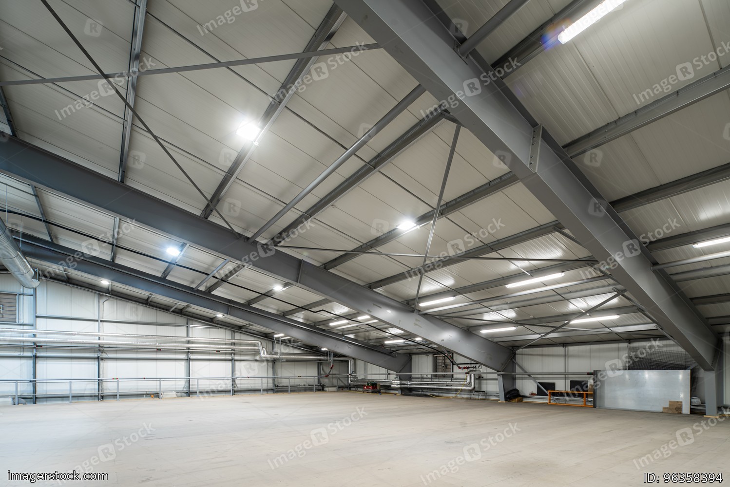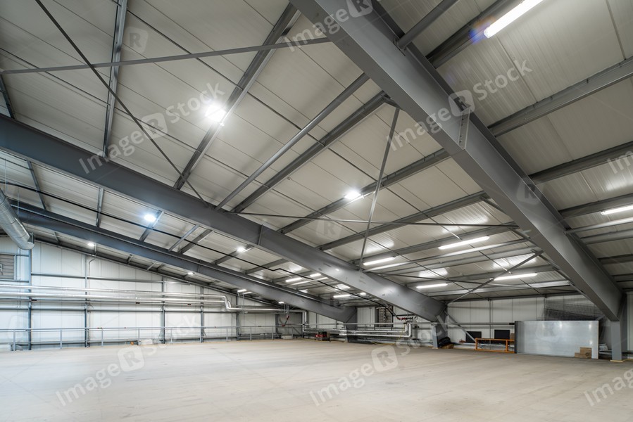 Interior of huge empty storehouse. Industrial warehouse racking.