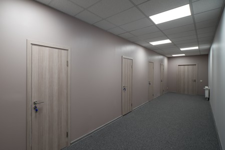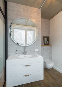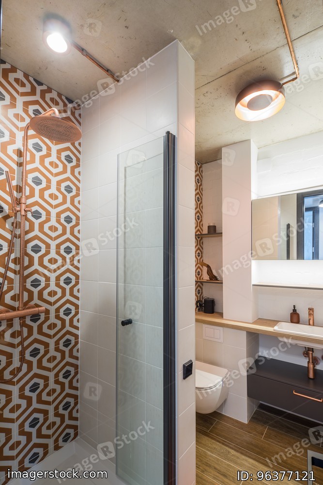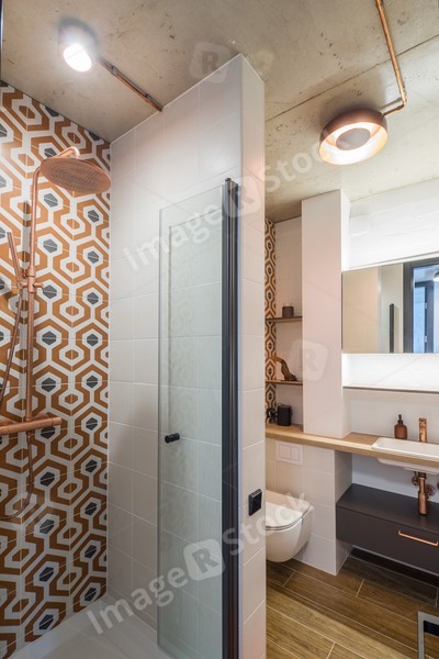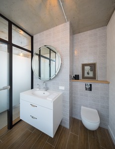 Interior of a bathroom in a modern apartment. Concrete ceilings.