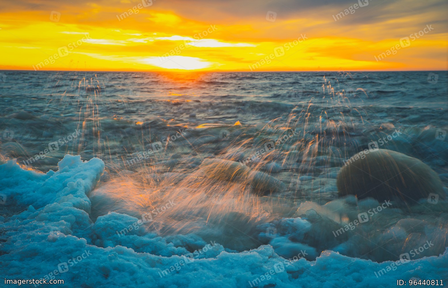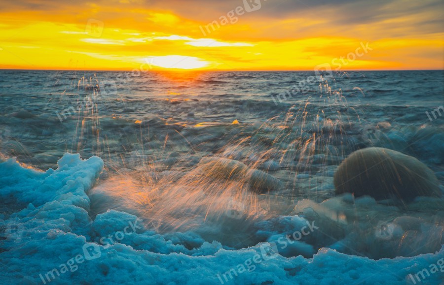 Scenic landscape of sunset above Baltic sea at winter. Long exposure.