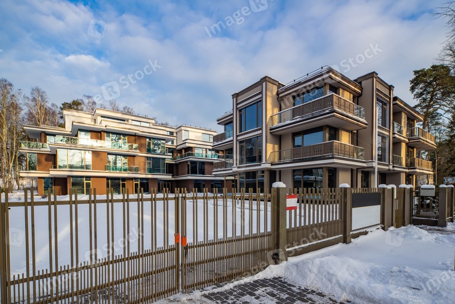 Modern exterior of new luxury residential building at winter.