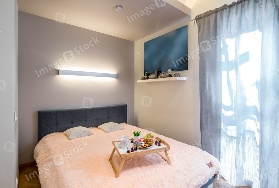 Small bedroom with light walls. Tray with breakfast on the bed. Food and drinks.