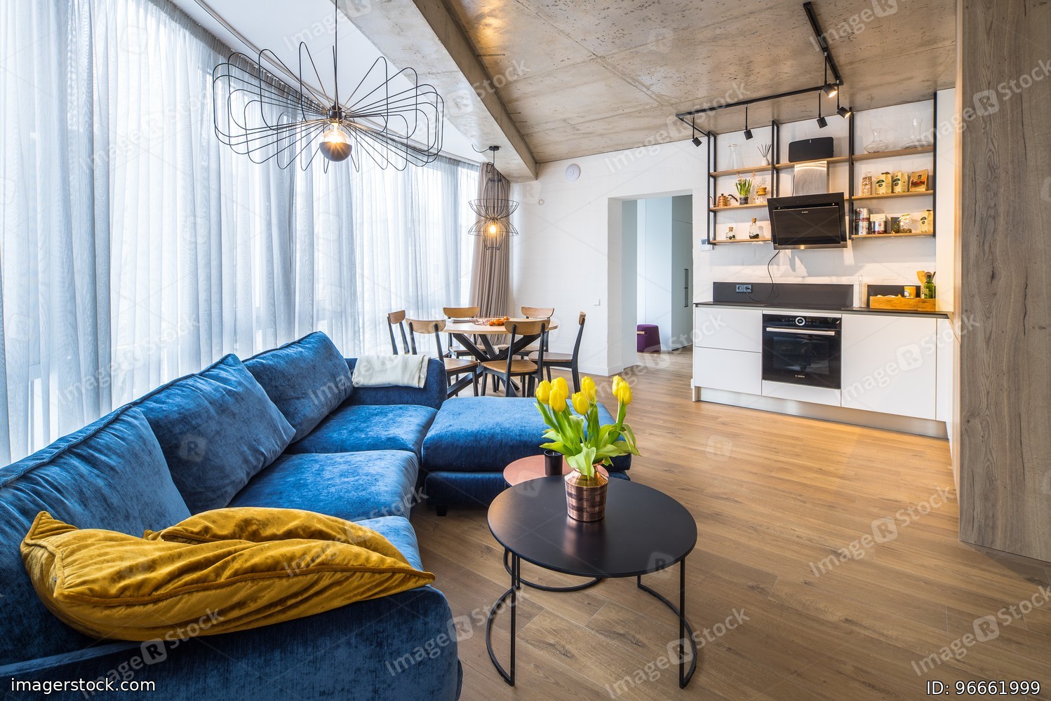 Interior living room bathroom with a sofa in the studio apartment. Concrete ceiling. Loft.