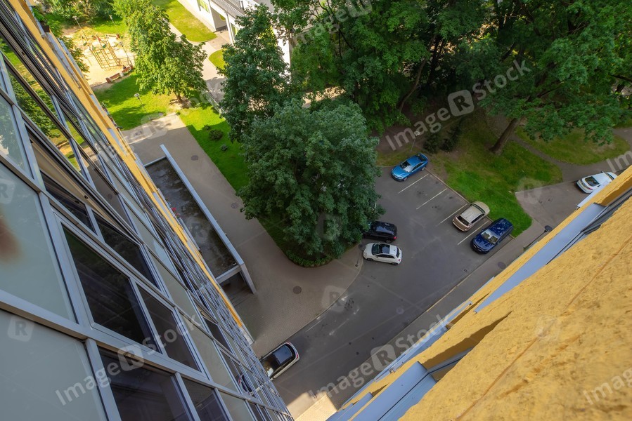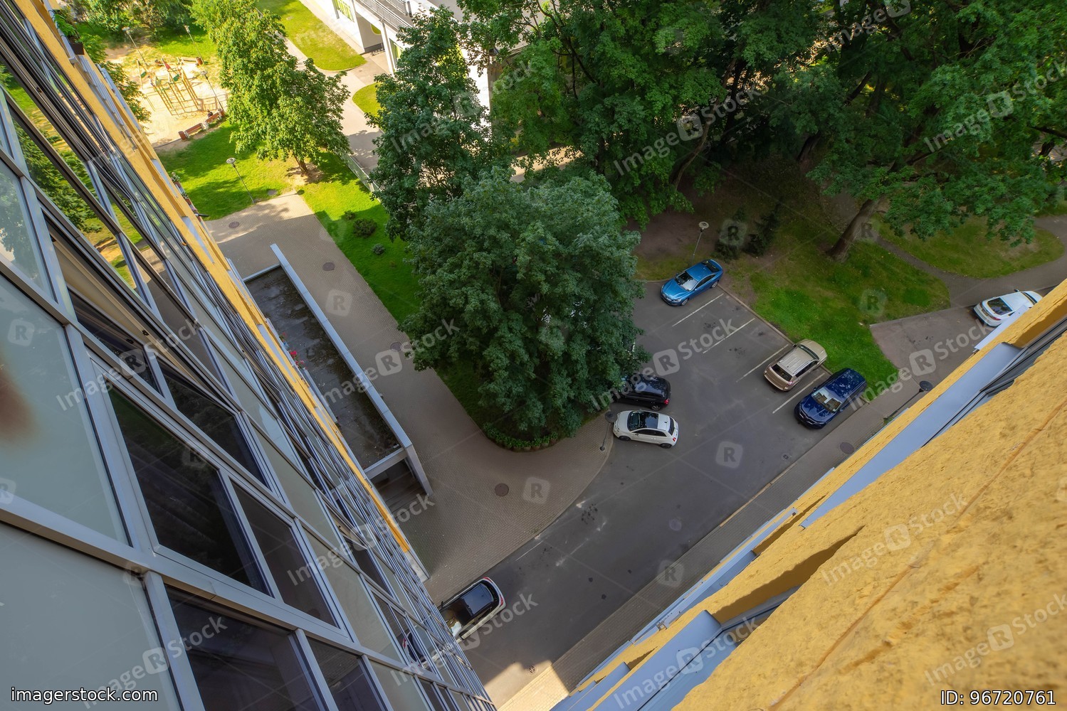 Modern exterior of office building. Glass wall. View from window of car parking.