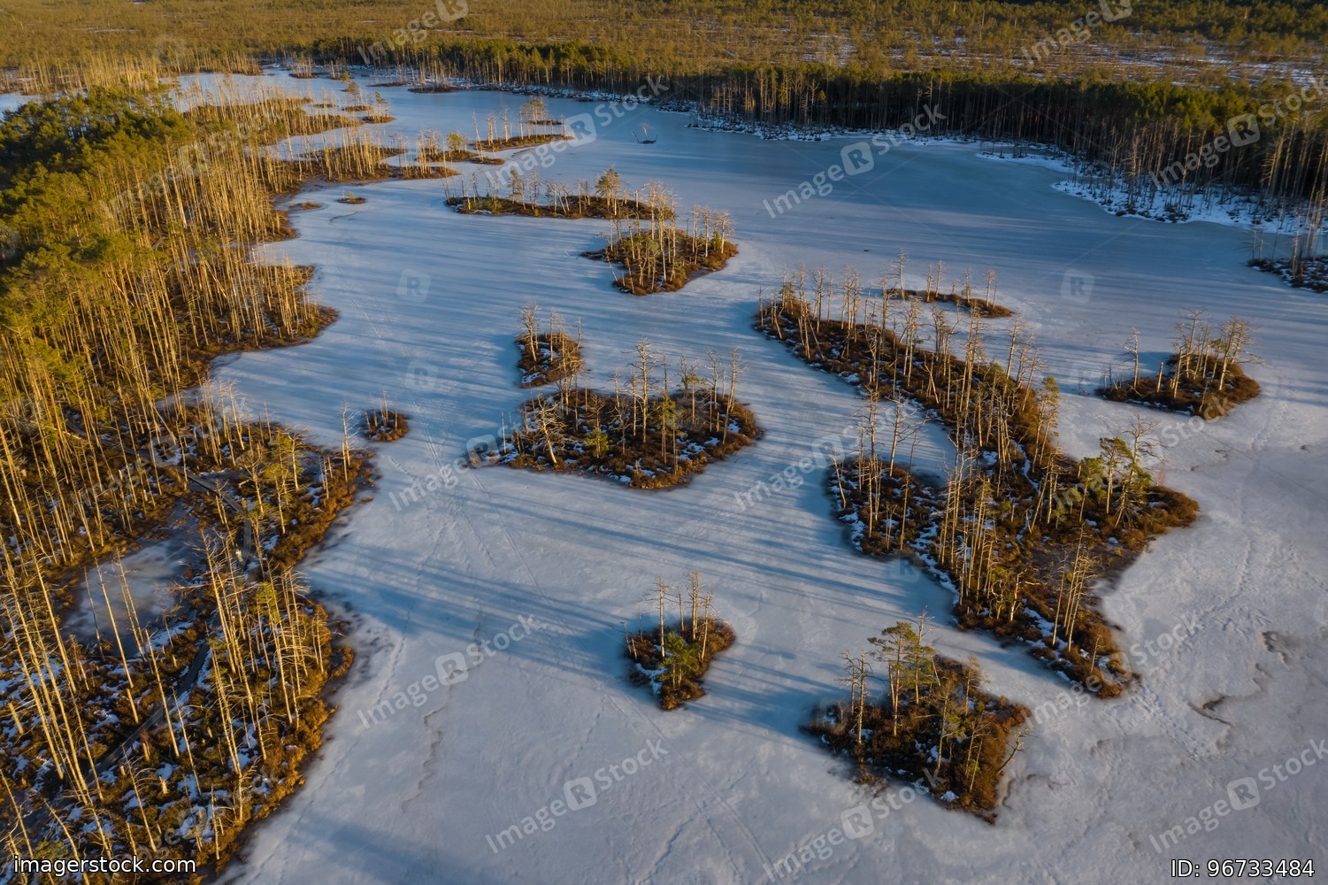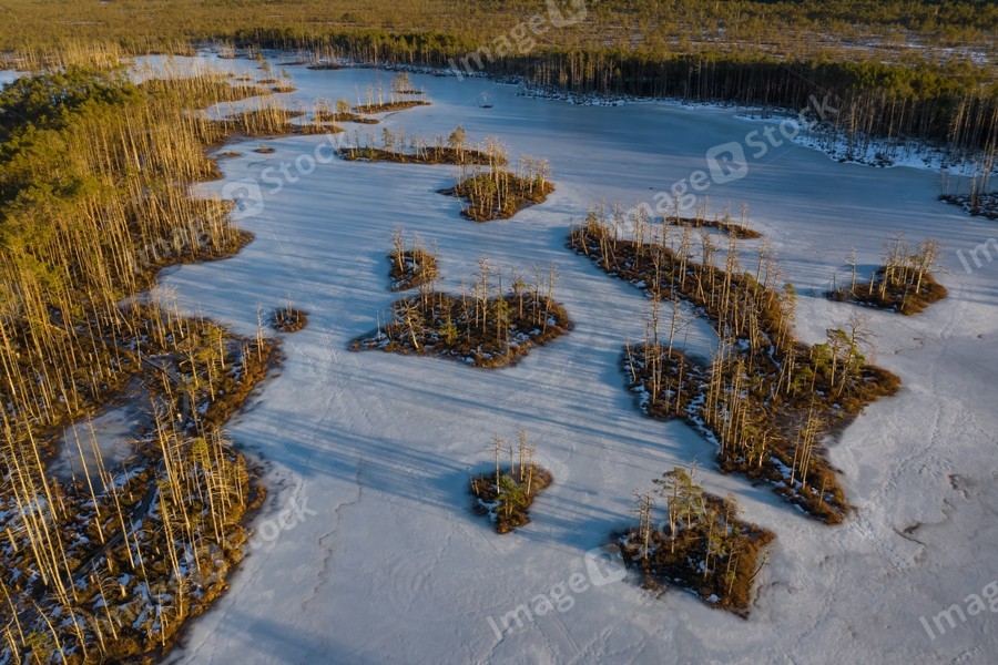 Scenic landscape of swamps at sunny day at early spring.