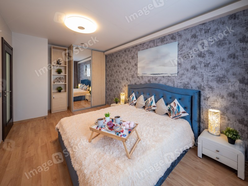 Interior of bedroom in modern apartment. Wooden wardrobe. Breakfast on bed.