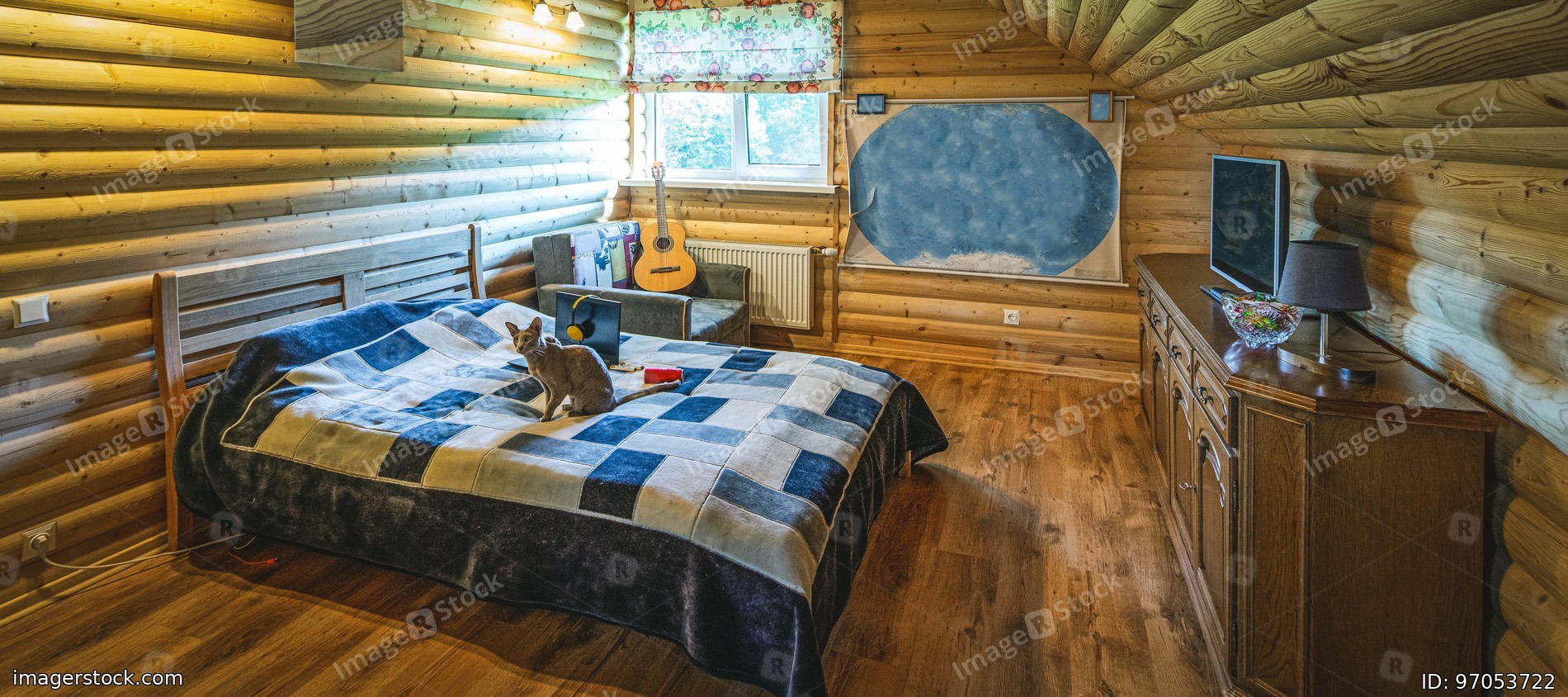 Wooden interior of attic bedroom with furniture. Private country house. Teenager room.