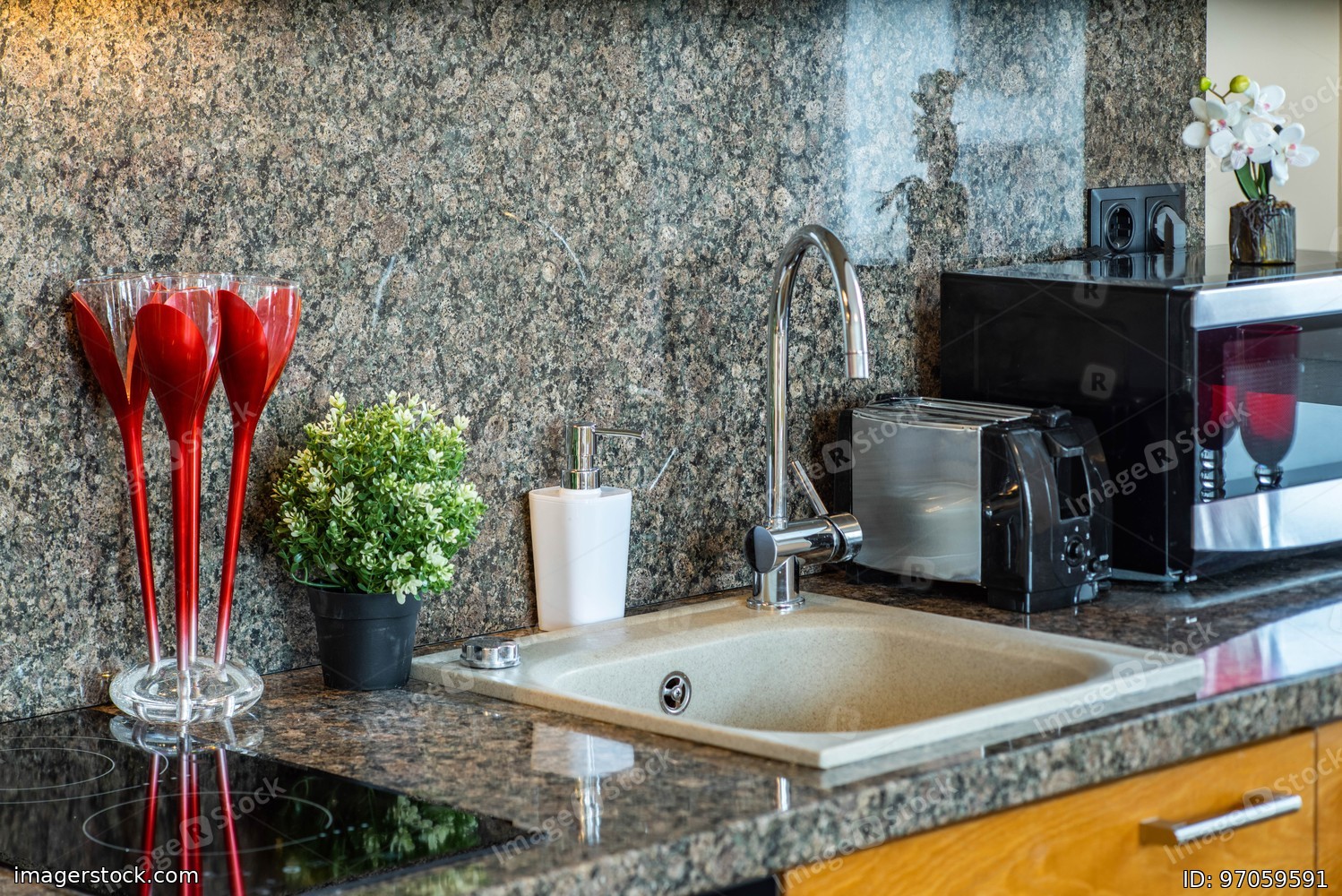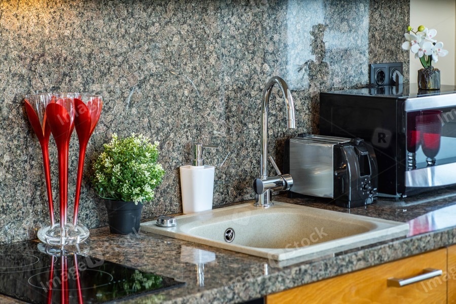Close-up of the kitchen set in apartment. Home appliances. Sink and soap.