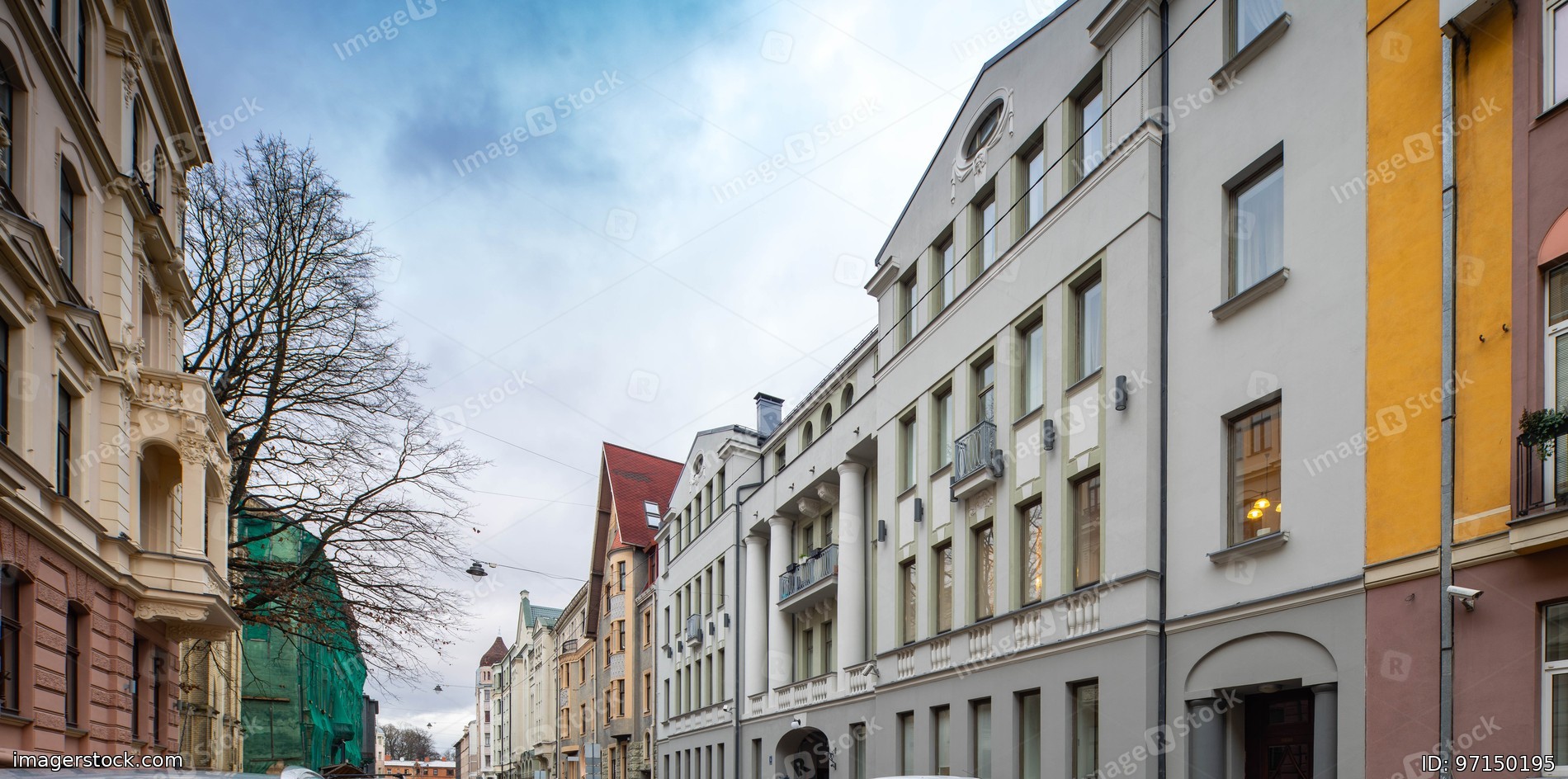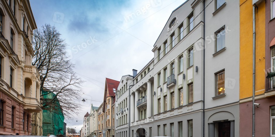 Modern buildings on the city street. Riga, Latvia. Art Nouveau architecture.