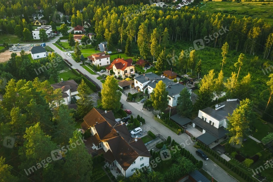 Aerial view of private sector in european city. Luxury exterior. Green trees. Cars and houses.