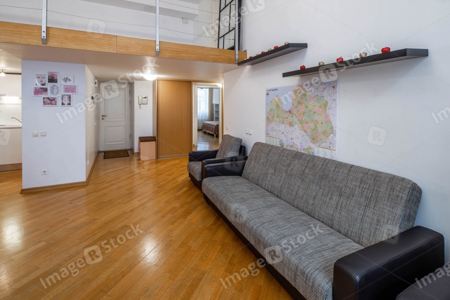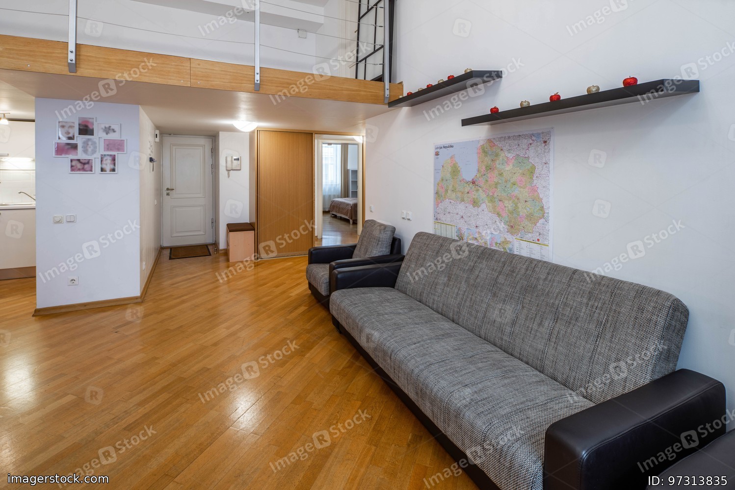 Modern interior of studio apartment. Wooden table. Cozy couch.