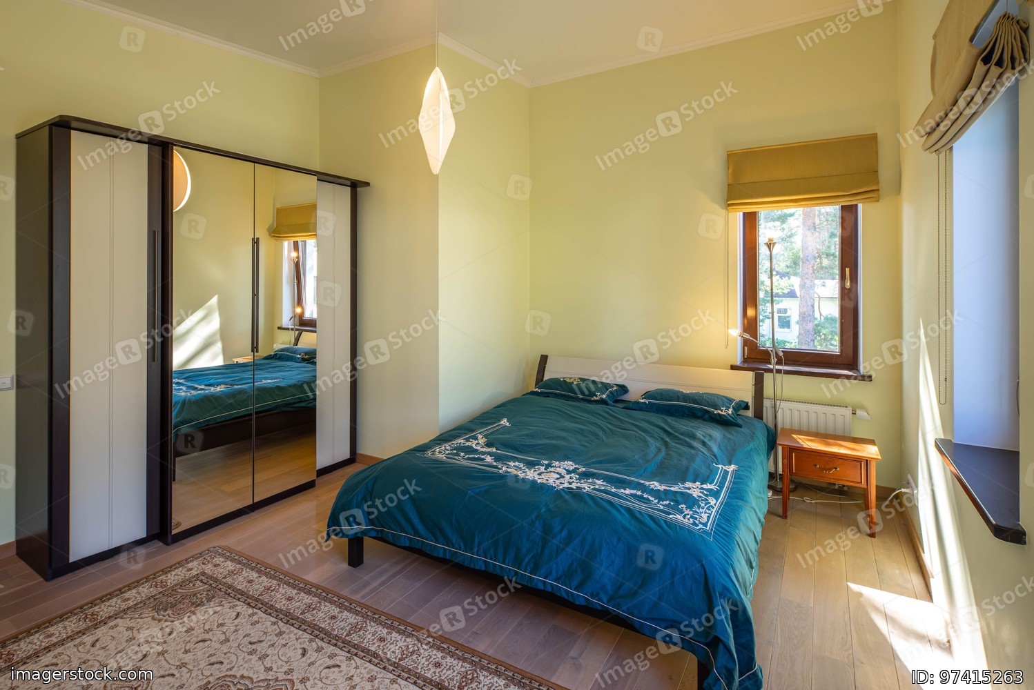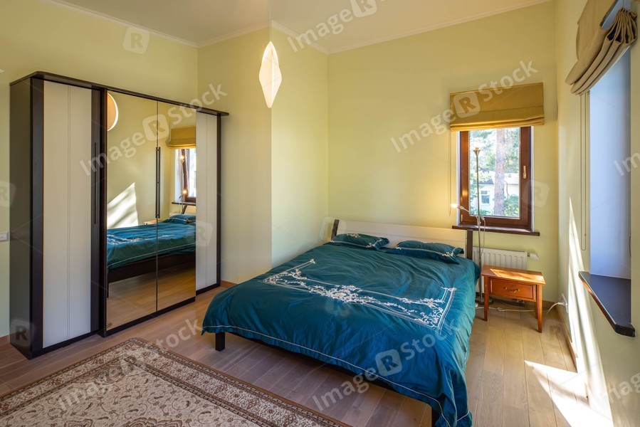 Modern interior of cozy bedroom in luxury apartment. Bed with blue pillows and blanket. Sliding door wardrobe. Wooden nightstand.
