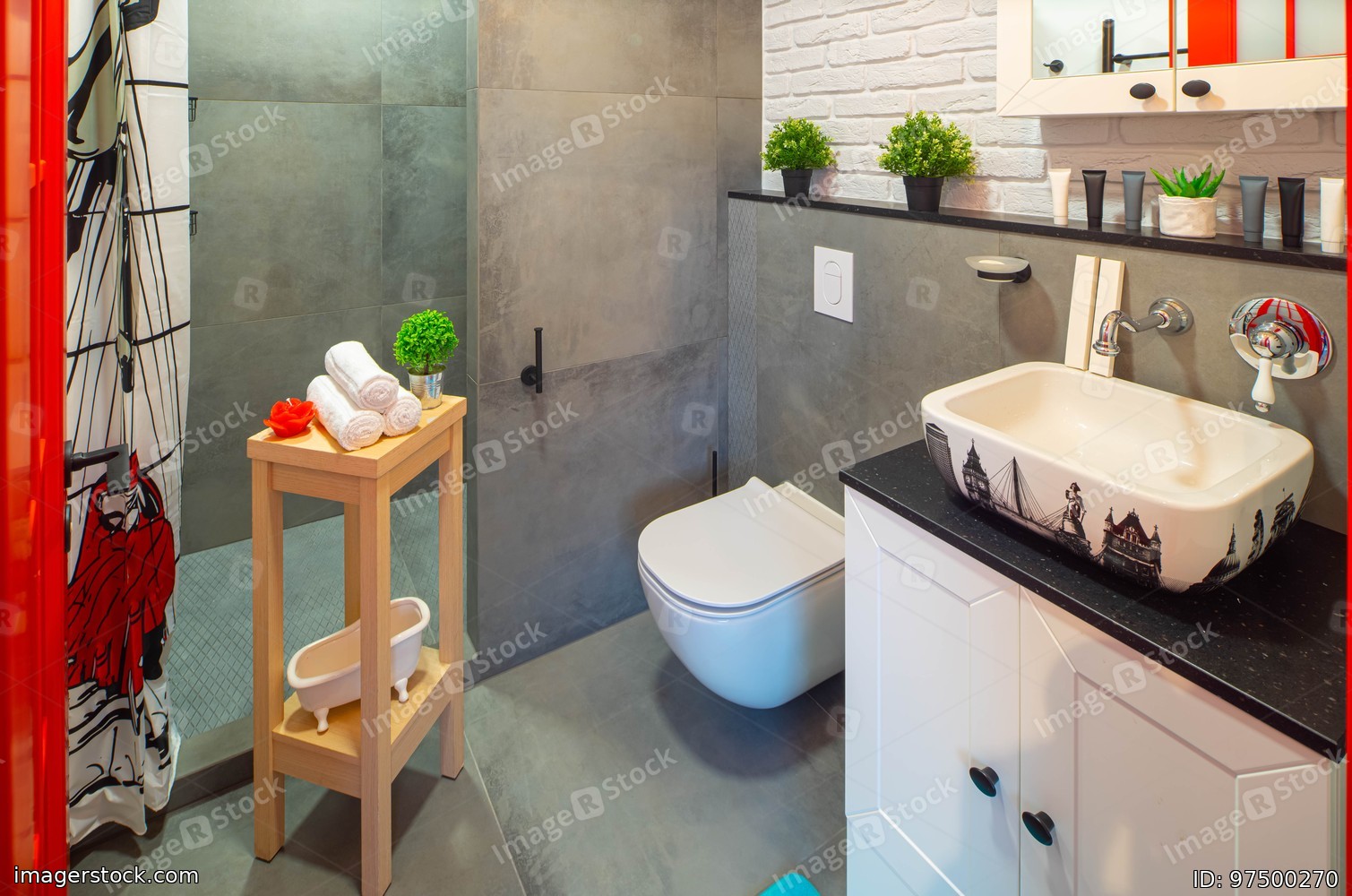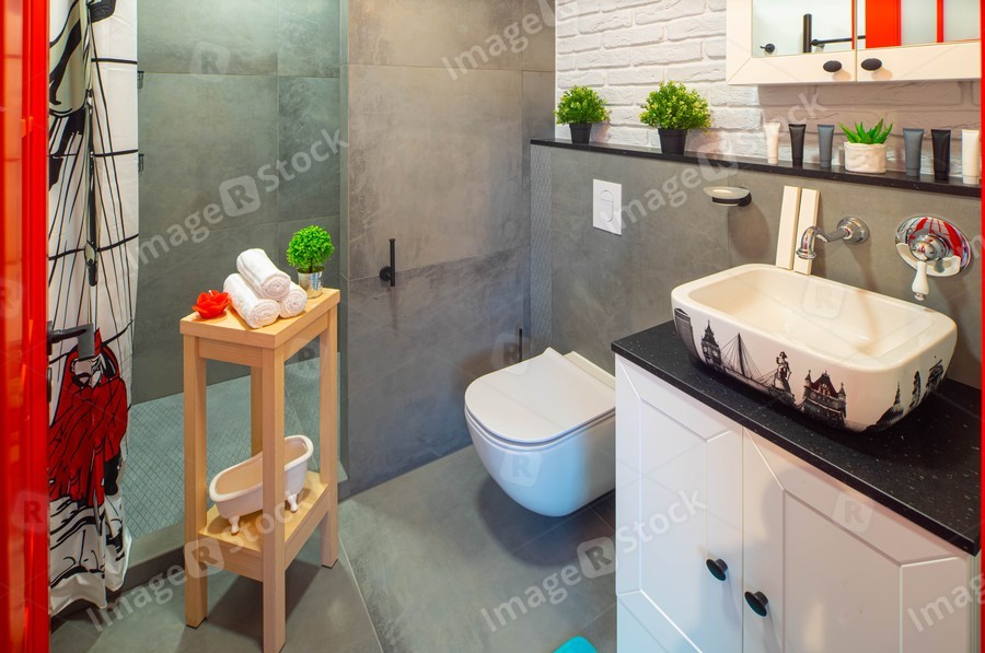 Modern loft interior of bathroom. White sink and toilet. Brick wall. Grey tile. Red door.