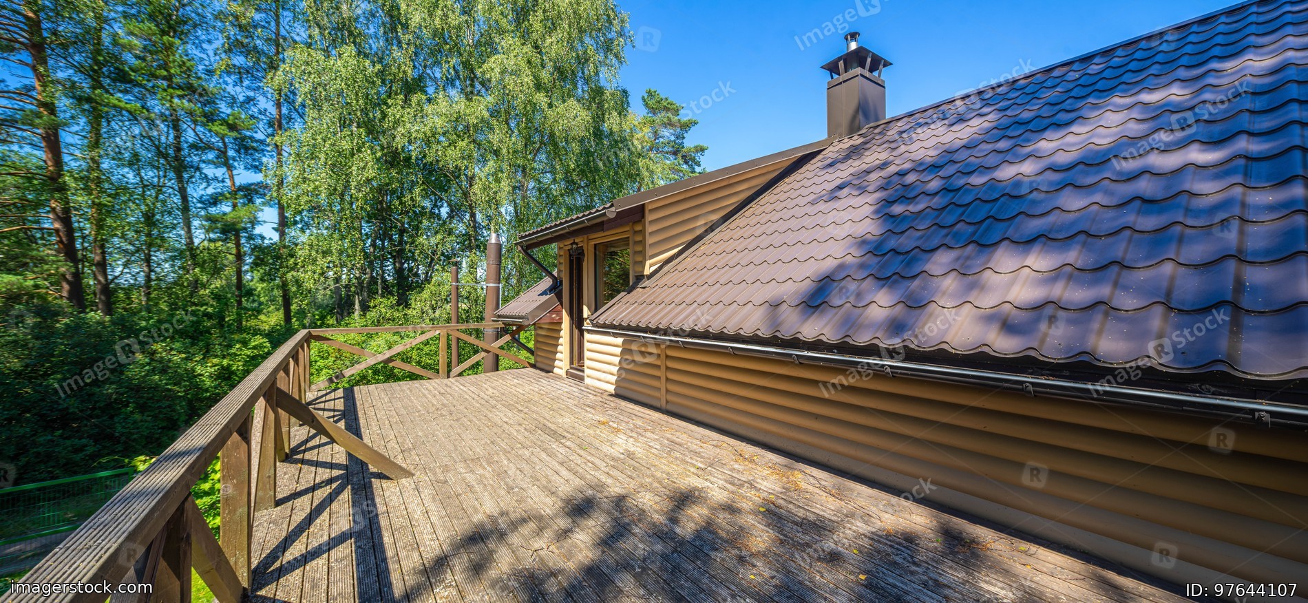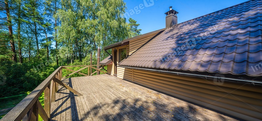 Large wooden terrace on the second floor in private country house near the forest. Sunny summer day.