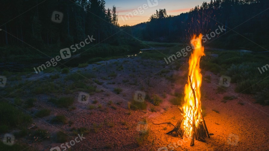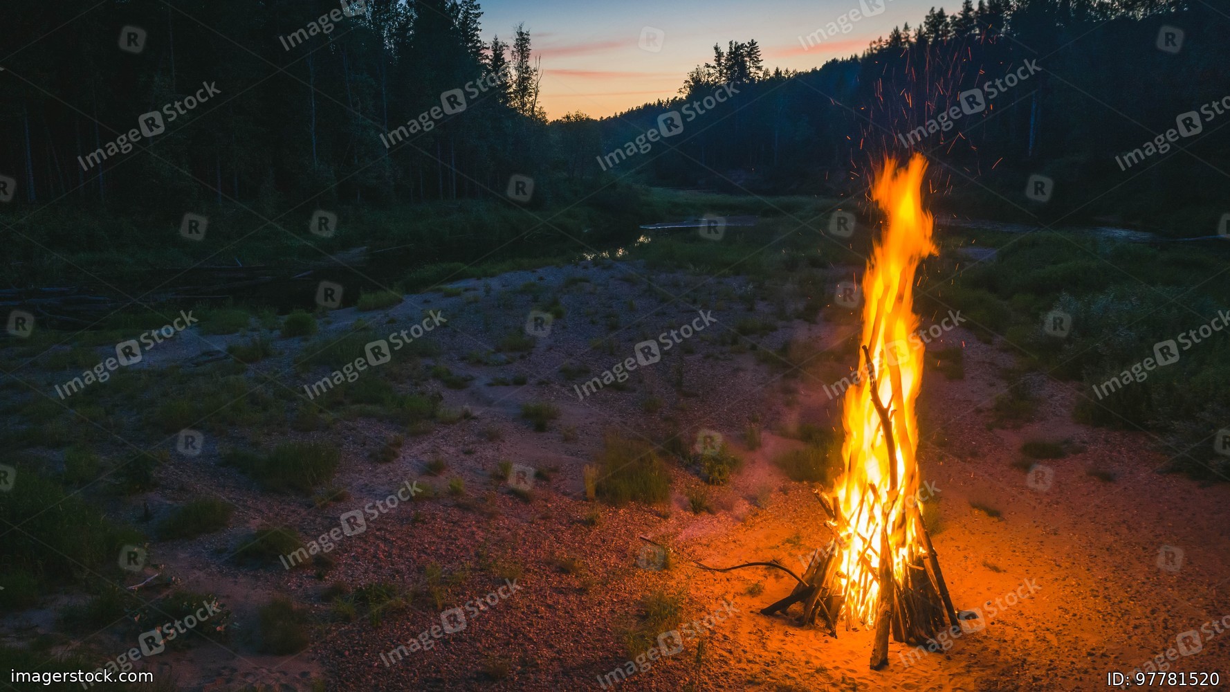 Midsummer Ligo celebration. Huge bonfire on the river shore. Scenic landscape of forest. Sunset sky.