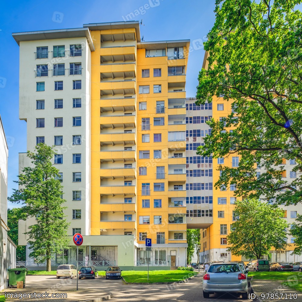 Modern city architecture of living complex. Sunny summer day. Exterior of residential building.