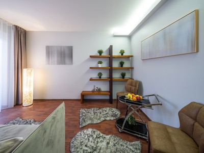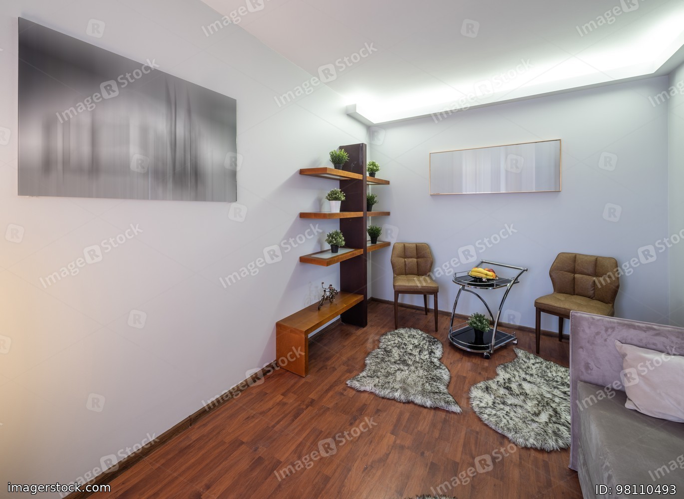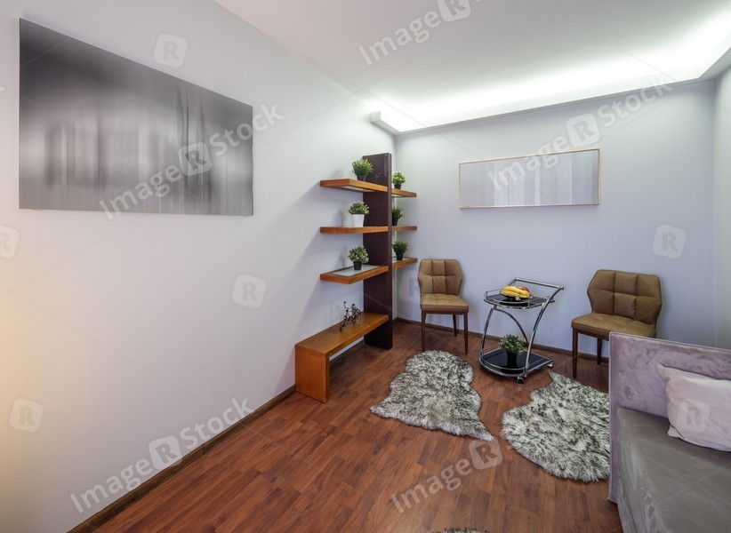 Modern interior of living room in luxury apartment. Flowers on wooden shelves.