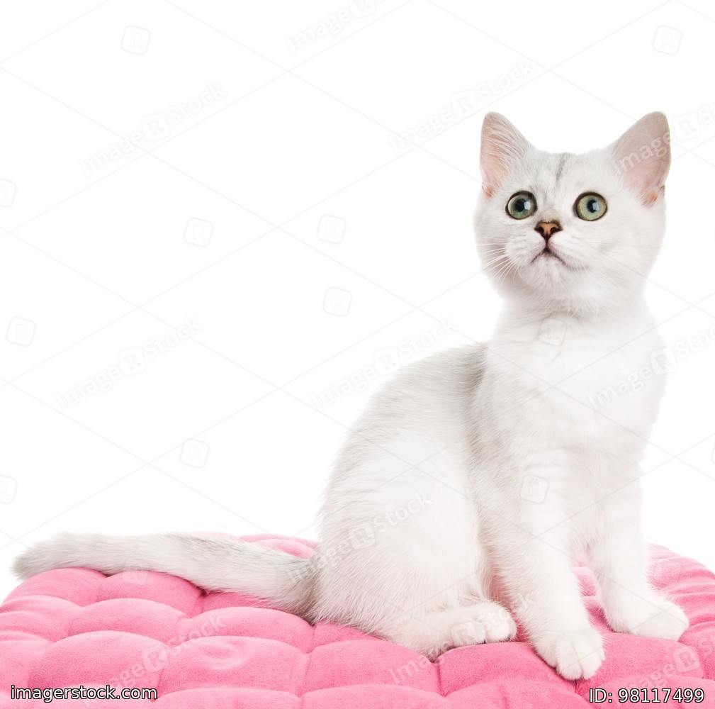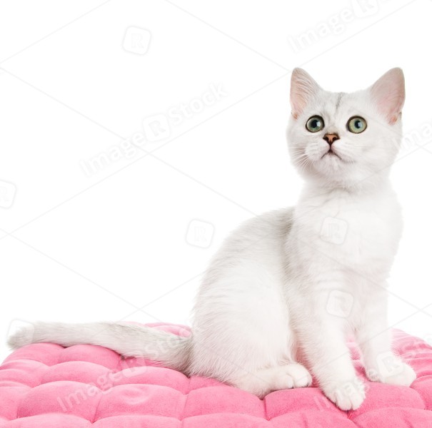 Beautiful british kitten sitting on a pink pillow. Isolated on white background