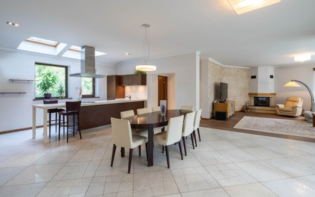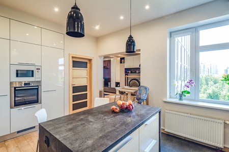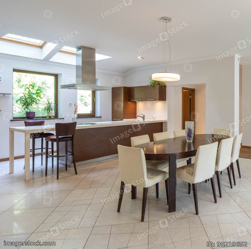 Modern interior of spacious luxury studio apartment. Wooden table and chairs. Kitchen set.