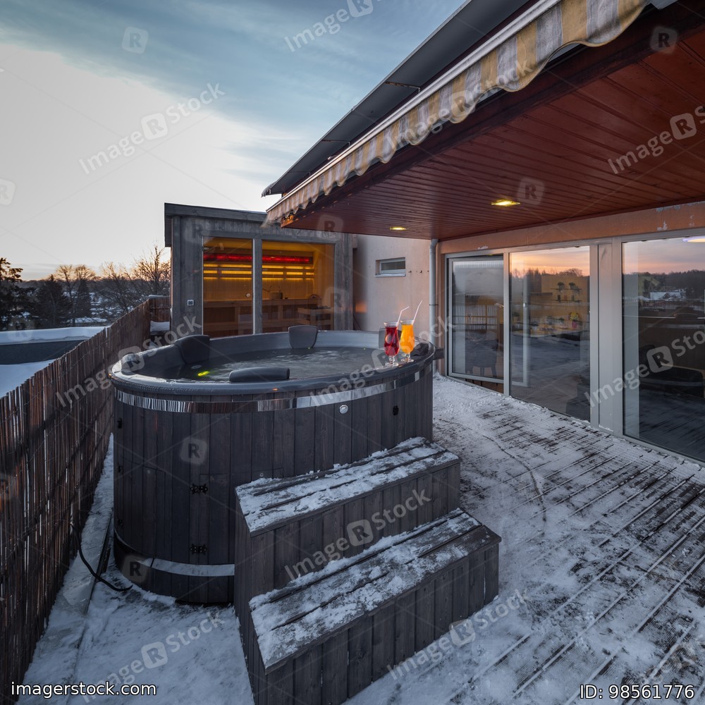 Open terrace with hot outdoor wooden bath tub. Luxury private house.