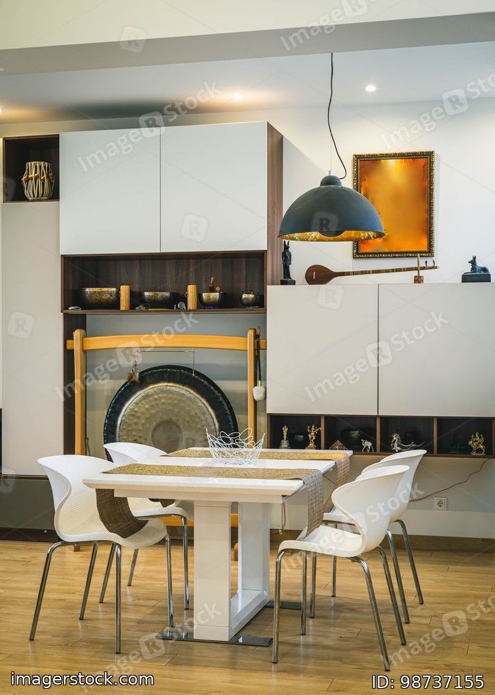 Contemporary interior of living room in luxury flat. Chairs and table. Stylish white wall unit with Tibetian bowls and decorative gong.