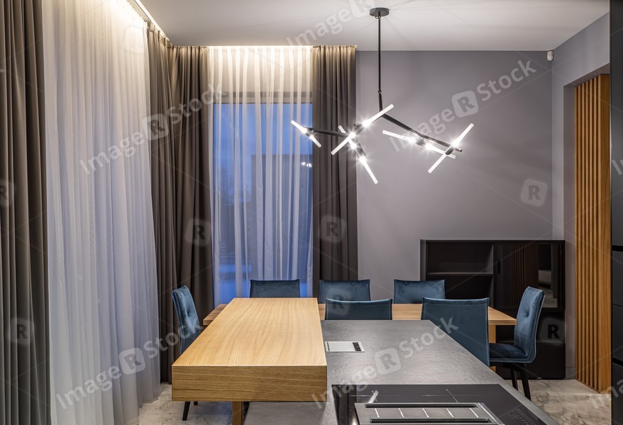 Modern grey and wooden interior of kitchen in luxury private house.