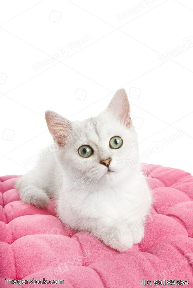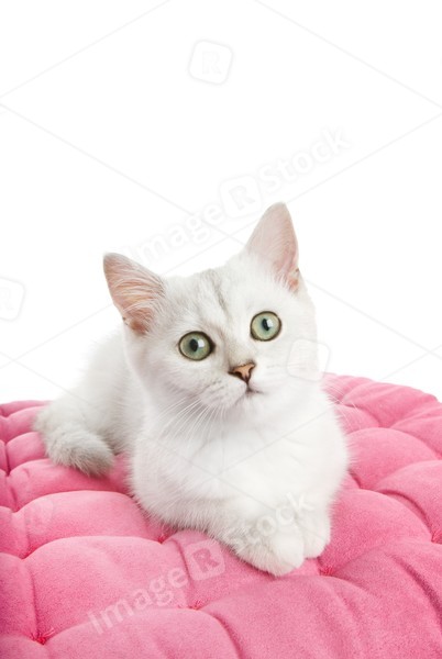 Beautiful british kitten lying on a pink pillow. Isolated on white background