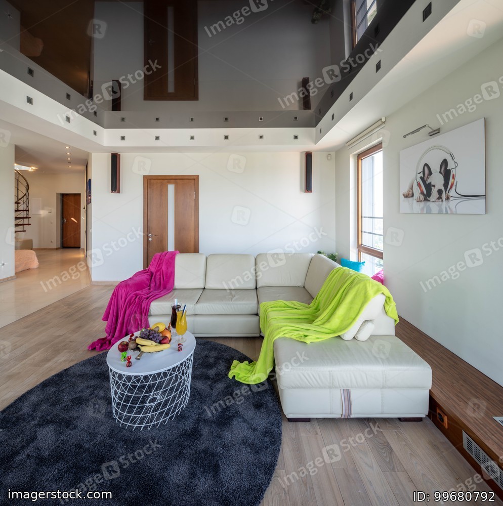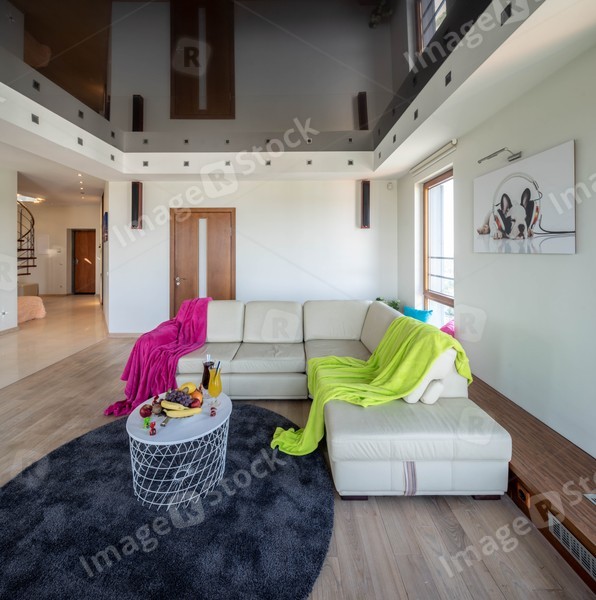 Sofa in living room. Modern interior of spacious apartment. Private house.