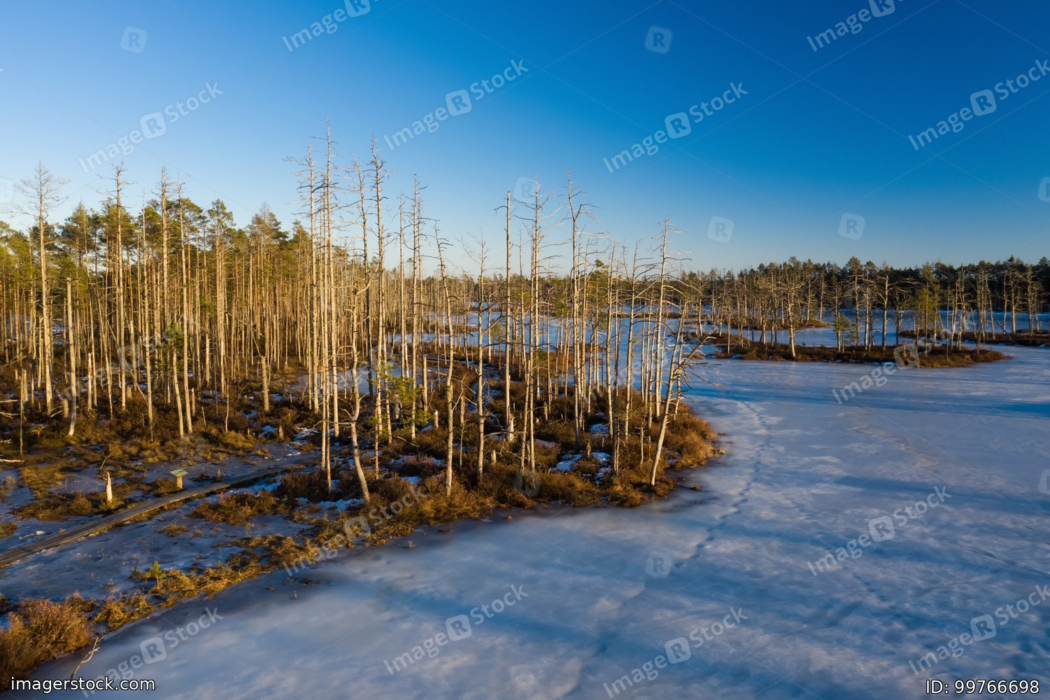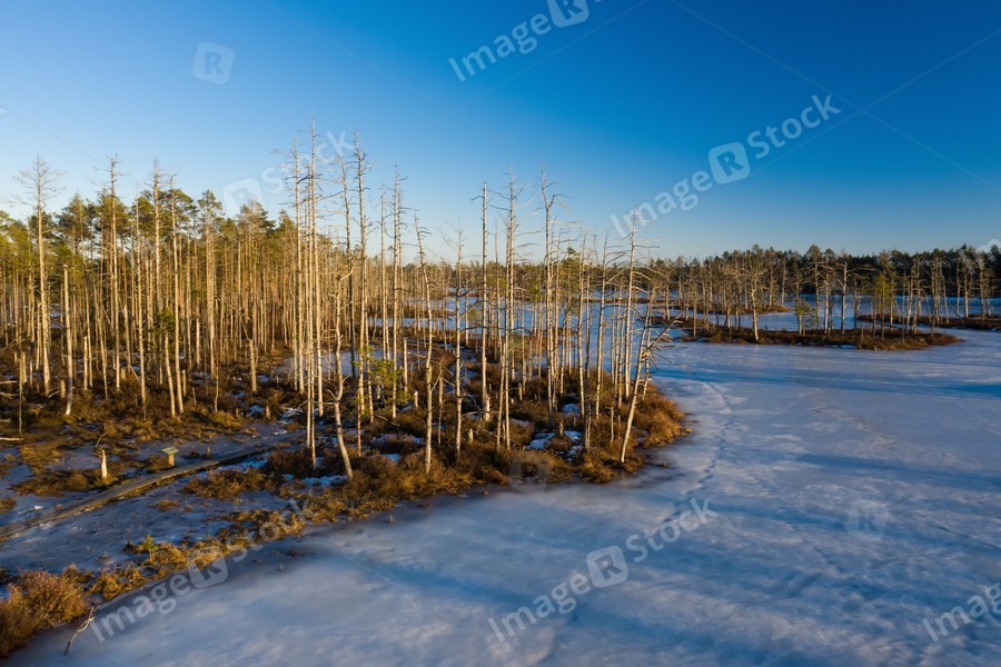 Scenic landscape of swamps at sunny day at early spring.