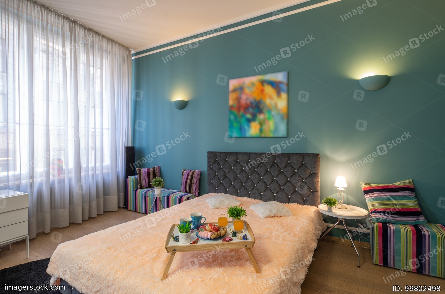 Modern interior of spacious studio apartment. Bedroom. King-size bed.