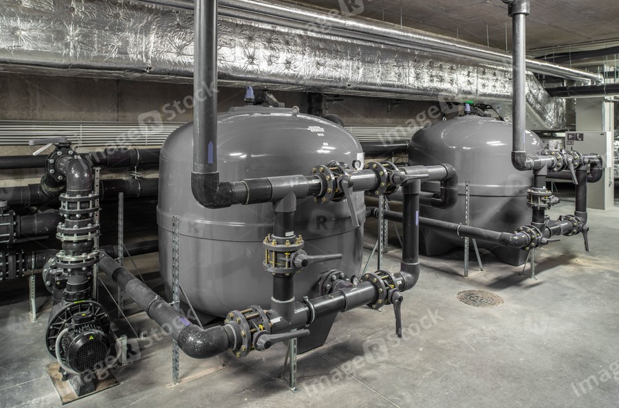 Boiler room. Heating system. Large boiler units. Metal piping system.