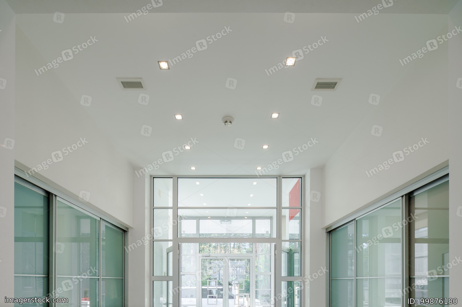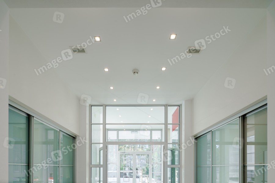 Modern interior of hall in luxury private house. Glass sliding doors.