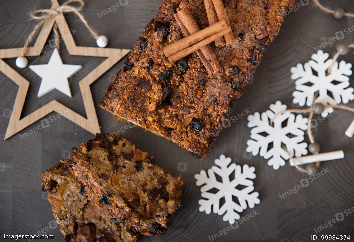 Homemade fruit bread with cosy winter decorations