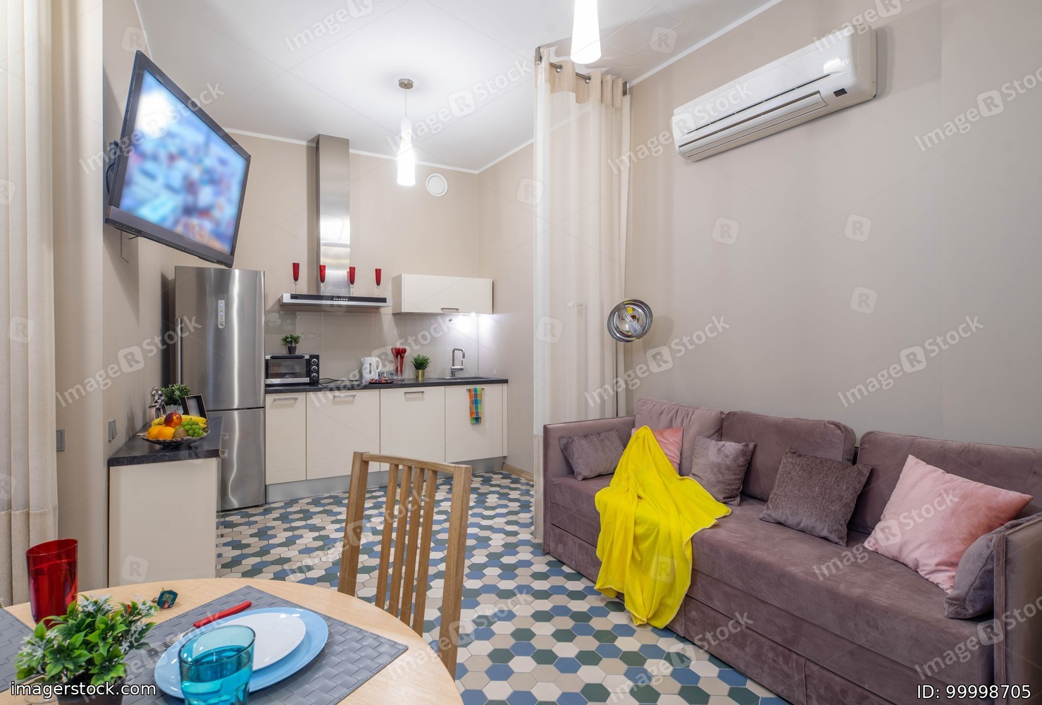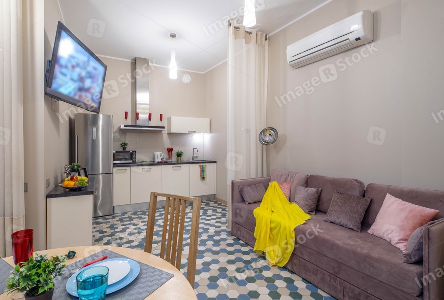 Modern interior of light studio apartment. Living room and kitchen.